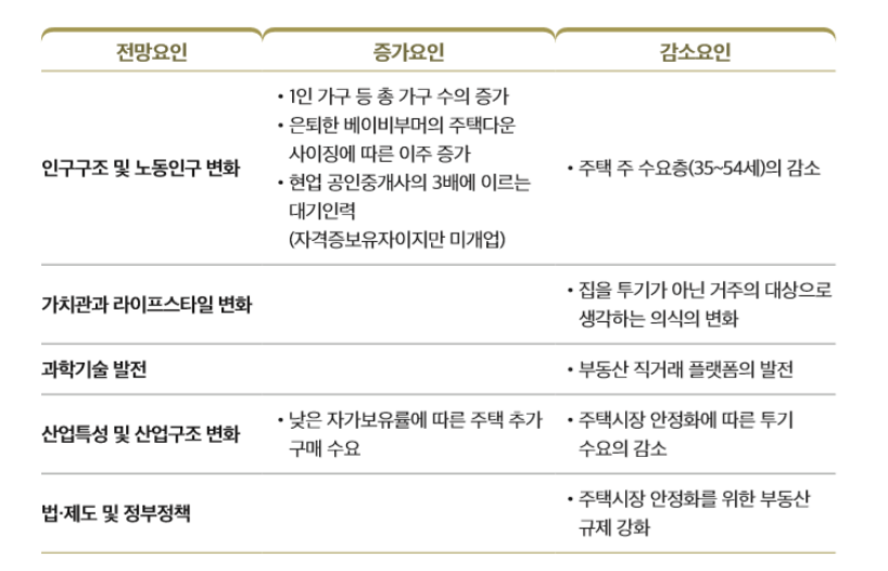 부정적 요인으로는 주택 주 수요층(35~54세)의 감소, 주택시장 안정화에 따른 투기수요의 감소(갭투자 등), 부동산거래 온라인플랫폼의 발전, 집을 투기가 아닌 거주의 대상으로 생각하는 의식의 변화 등이 있습니다. 최근, 부동산시장에 큰 변화는 부동산중개 관련 웹사이트나 어플리케이션의 등장입니다.