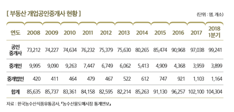 국토교통부(국토교통통계누리)의 ‘부동산 개업 공인중개사 현황’에 따르면 2018년 1분기 기준, 개업을 한 공인중개사는 104,304명(중개법인 포함)입니다.
