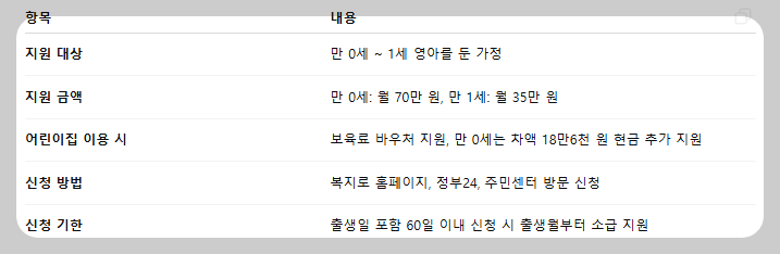만 0세 아동에게 월 70만 원, 만 1세는 월 35만 원까지 현금으로 지원되는 제도입니다.