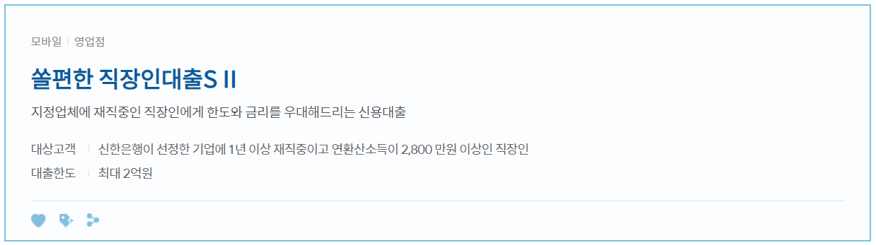 쏠편한 직장인대출S는 신한은행이 선정한 기업에 1년 이상 재직중에 연소득 2,800만원 이상인 직장인을 대상으로 하며 최대 2억원까지 대출이 됩니다. 앞서 설명한 쏠편한 직장인대출보다 받을 수 있는 금액은 많되 서류심사의 기준이 높다고 보시면 됩니다.