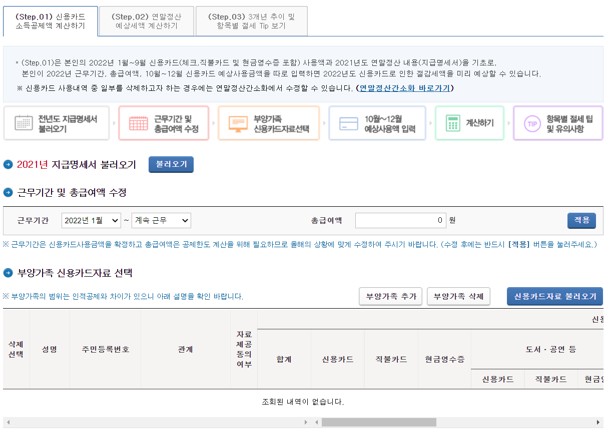여기서 부양가족 신용카드자료 선택 보이시죠? 위에서 말했듯 신용카드는 누가 소득공제를 받느냐에 따라 세금 공제 금액이 달라지기 때문에 미리 부양가족 신용카드자료를 선택해서 계산을 내봅니다. 예시를 하나 보고 가겠습니다.