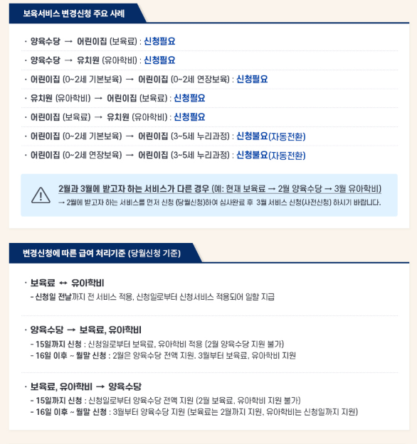 ※ 사전신청 종료 후 2.28.(금) 16:00 ~ 24:00 기간동안 보육료, 유아학비, 양육수당, 부모급여, 아동수당 서비스 신청이 중단됩니다.