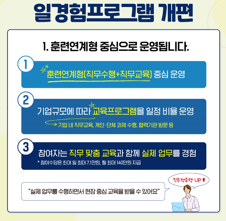 - 참여자는 직무 맞춤 교육과 함께 실제 업무를 경험 *참여수당은 최대 일 최대 7.1만원, 월 최대 140만원 지급