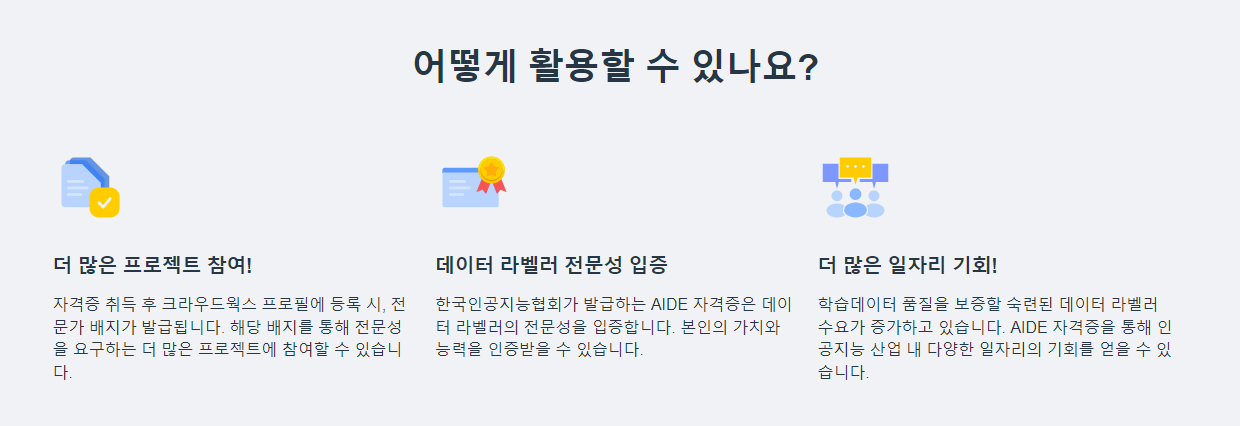 인공지능 데이터 전문가 자격증은 데이터 라벨링을 전문적으로 할 수 있는지의 역량을 판단하고 발급되어집니다. AIDE 라고도 불리는 이 자격증은 2급과 1급으로 나뉘어져 있습니다. 2급은 인공지능 기초 이론과 데이터 라벨링 작업의 능력을 증명하고, 1급은 인공지능 심화 이론과 검수에 대한 능력을 증명합니다.